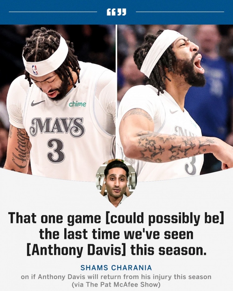 名记Shams在播客节目中也谈到了独行侠另一位球星安东尼-戴维斯的情况:“安东尼-戴维斯自独行侠首秀以来就一直缺阵,我认为他和他的经纪团队会进行商讨,并且会有一些非常艰难的对话,不能排除这样的可能性——那场比赛可能是我们本赛季最后一次看到安东尼-戴维斯出战。”