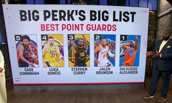帕金斯列联盟目前前5控卫:SGA、布伦森、库里、东契奇、CC