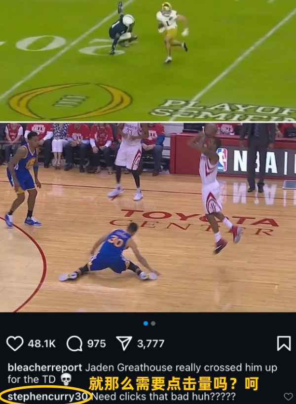 在这次达阵后不久,美媒露天看台(Bleacher Report)在他们的社媒主页上分享了这一动作的截图,并配上了一张9年前库里在比赛中摔倒的截图,配文写道:“Jaden Greathouse 真的越过了他完成达阵