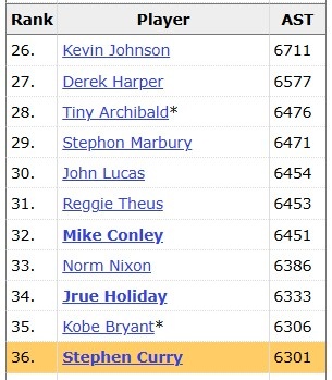 这样一来,库里生涯常规赛助攻已经达到6307,超越科比(6306)排名历史第35位。