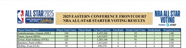 1月24日讯 今天,NBA官方公布了2025年全明星的最终选票详情。