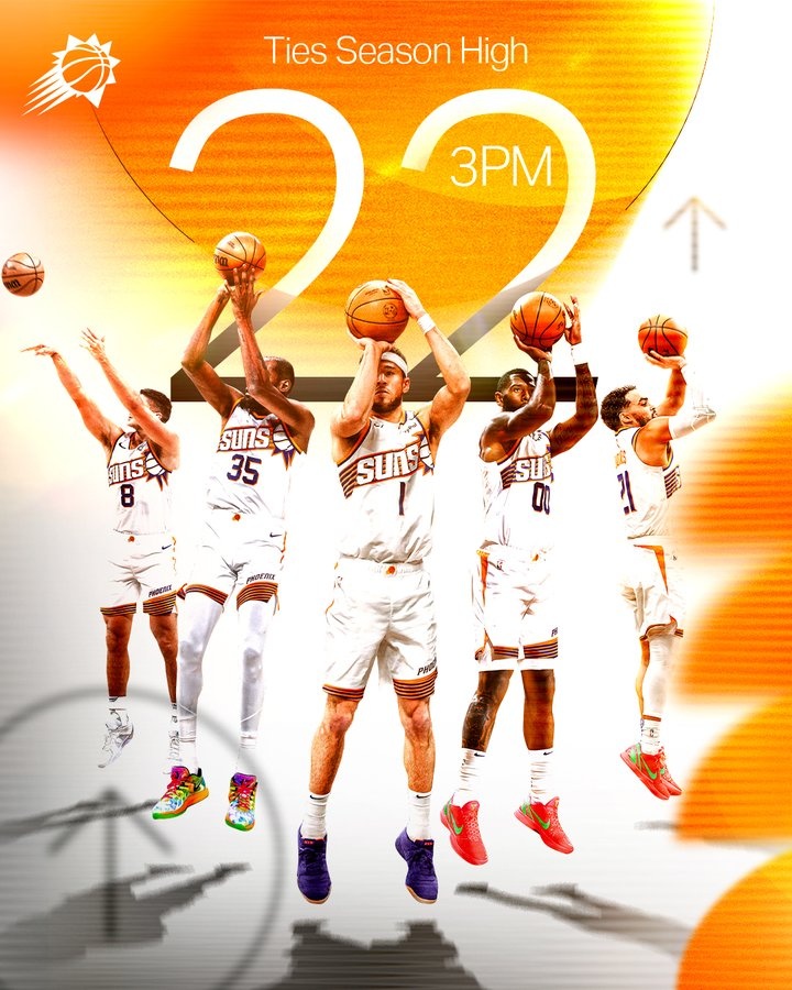 本场比赛,太阳全队三分球47投22中,这也追平了球队本赛季的单场三分命中数纪录。