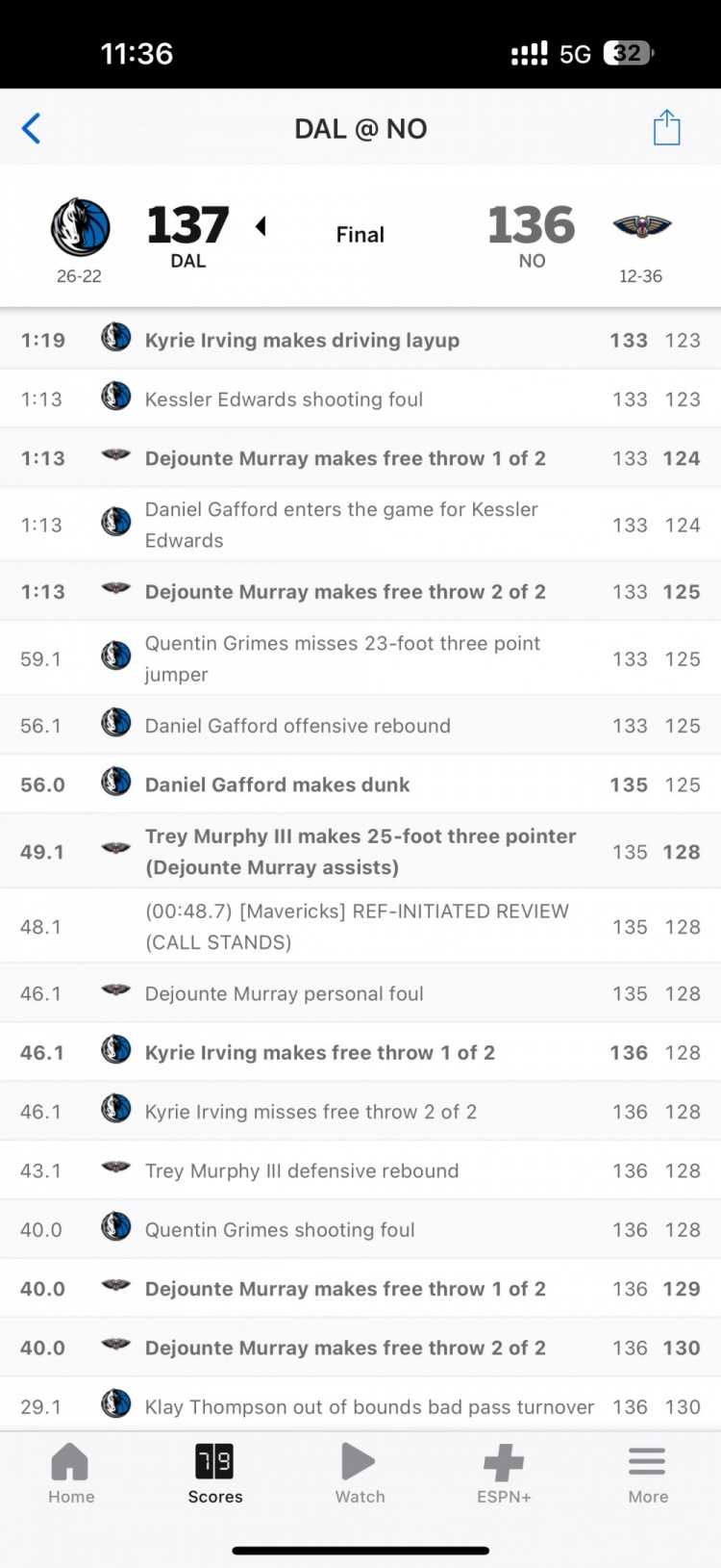 本场最后56秒加福德扣篮后独行侠领先到10分。但随后风云突变,鹈鹕打出一波11-2,最终独行侠1分险胜。