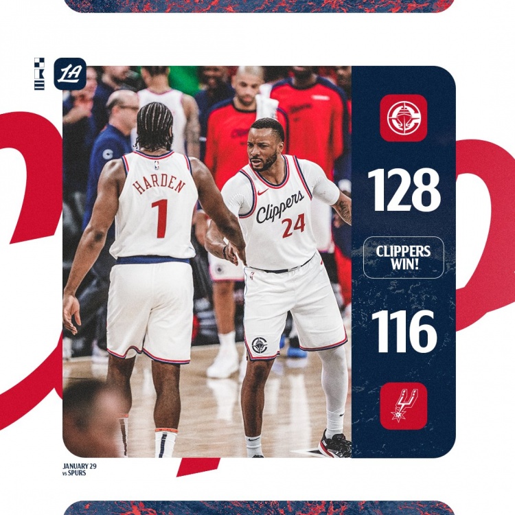 1月30日讯 NBA常规赛,快船128-116战胜马刺。