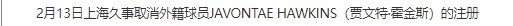 2月14日讯 今天,CBA官方更新了外籍球员注册信息表,上海取消了因伤赛季报销的贾文特-霍金斯。