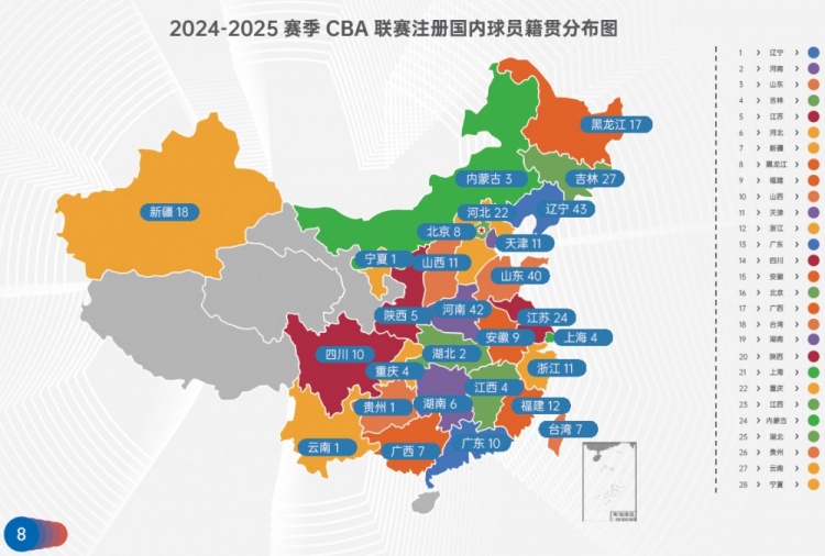 据统计,本赛季CBA注册本土球员籍贯分布中,辽宁(43人)、河南(42人)、山东(40人)仍然断档领先。