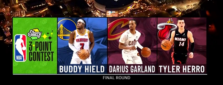 02月16日讯 NBA2025年旧金山全明星周末三分大赛在大通中心进行,决赛参赛队员:希尔德、加兰、希罗。