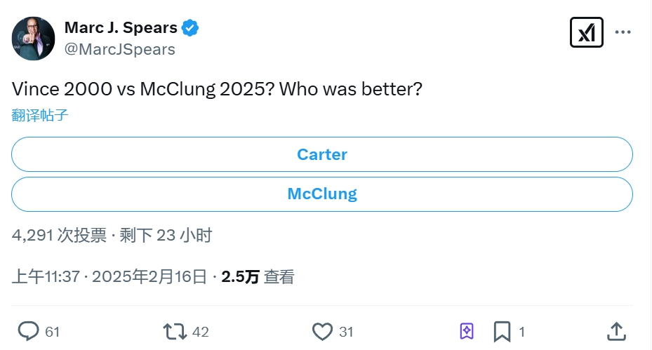 名记Marc J Spears发问:“00年的卡特VS25年的麦克朗,谁更强?”