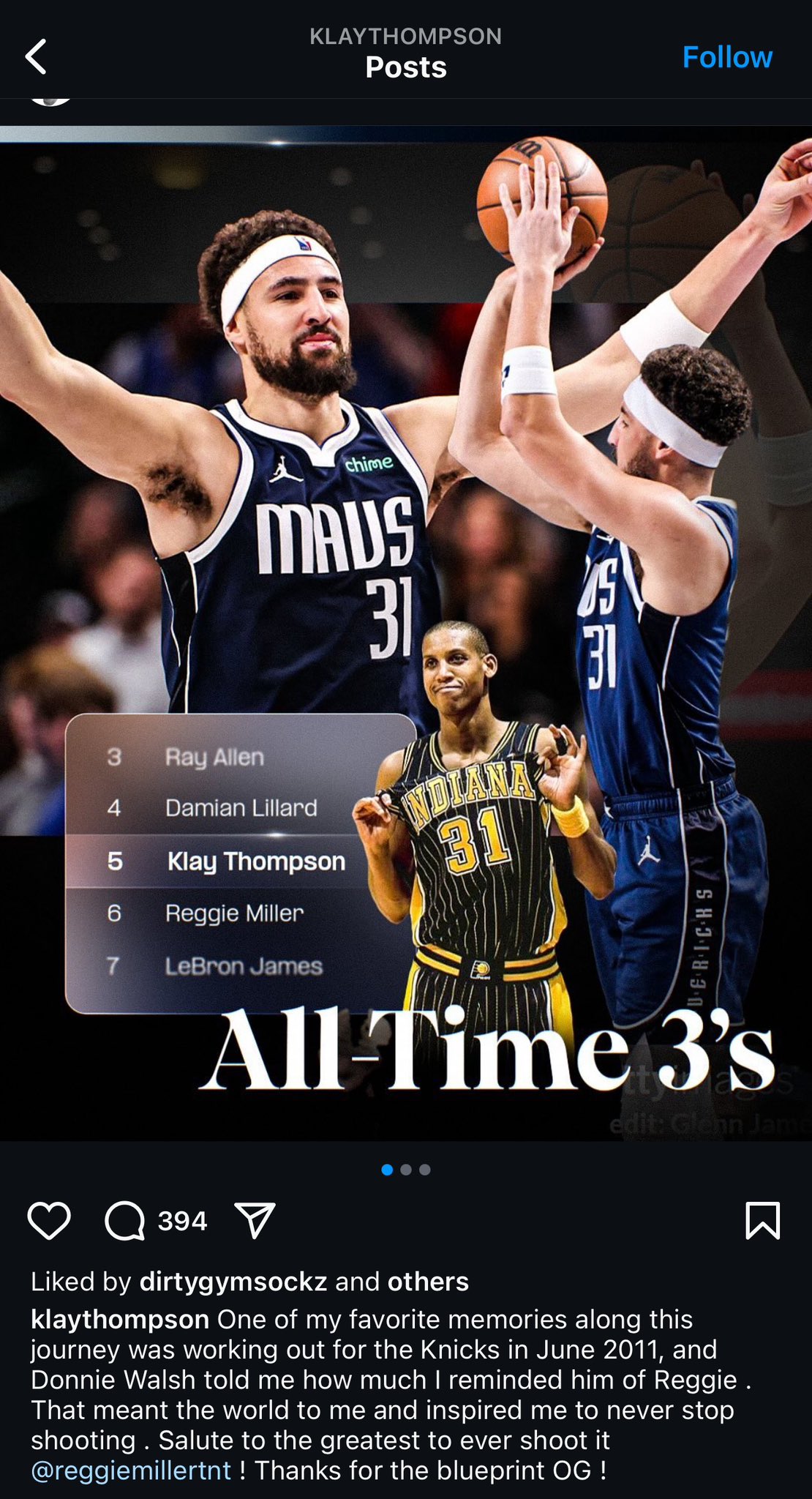 “这一路以来我最爱的回忆就是2011年为尼克斯试训,唐尼-沃尔什(时任尼克斯总经理)跟我说我有多像雷吉-米勒。这对我来说意味着全世界,激励我永不停止去投篮。向历史最佳射手@雷吉-米勒致敬!谢谢你铺设的篮图,老炮!”克莱写道。