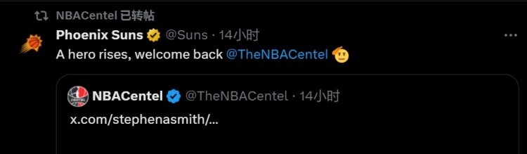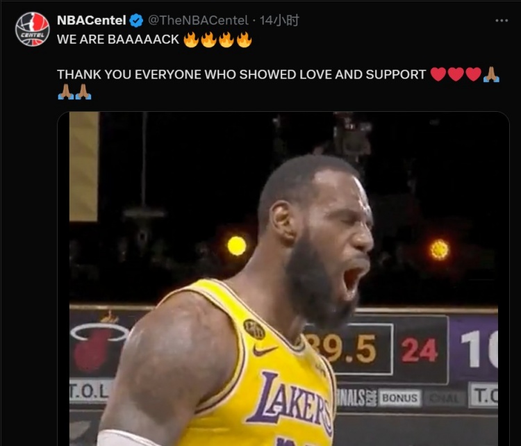 很多账号都对NBA Centel的回归感到振奋,活塞、国王、热火、太阳的官推都向NBA Centel送上了祝贺。