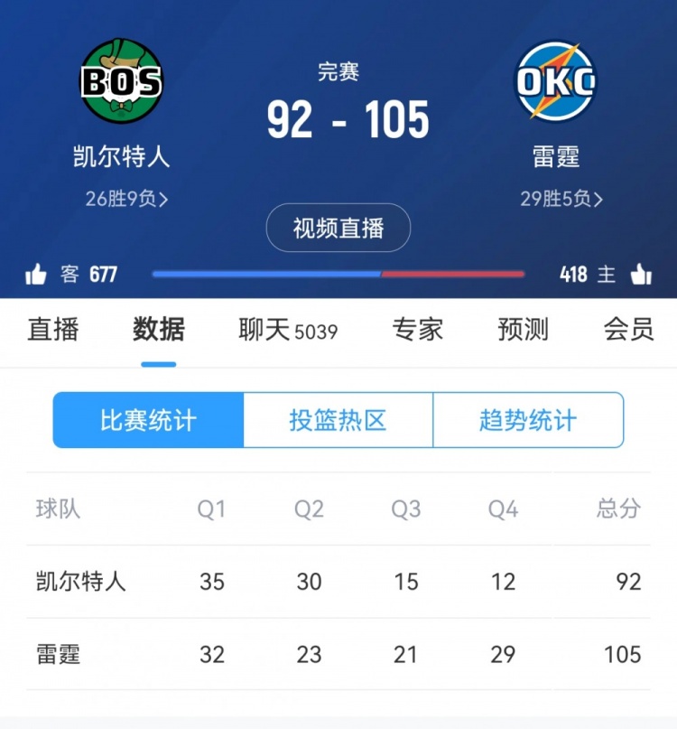 1月6日讯 NBA常规赛,凯尔特人92-105不敌雷霆。