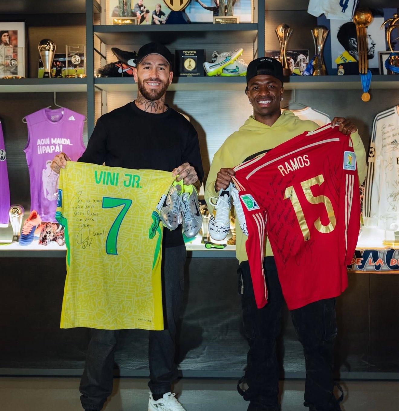 皇马边锋维尼修斯也在近日拜访了前辈拉莫斯的家,两人交换国家队球衣并合影留念。
