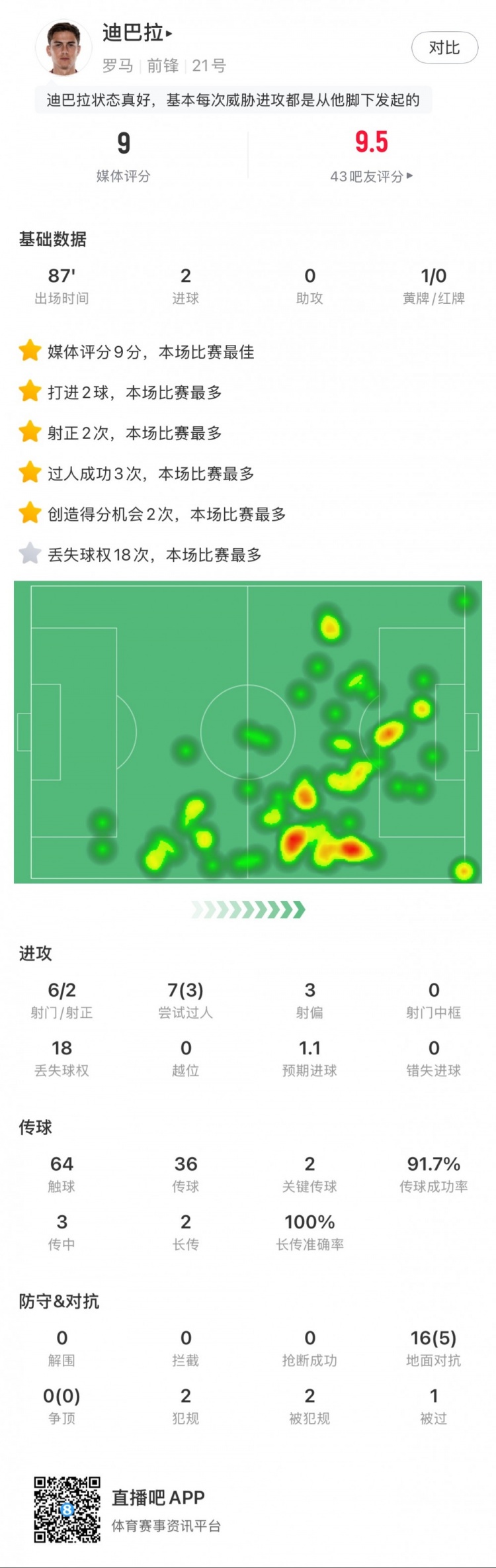 迪巴拉全场数据:2粒进球,2次创造得分机会,3次成功过人