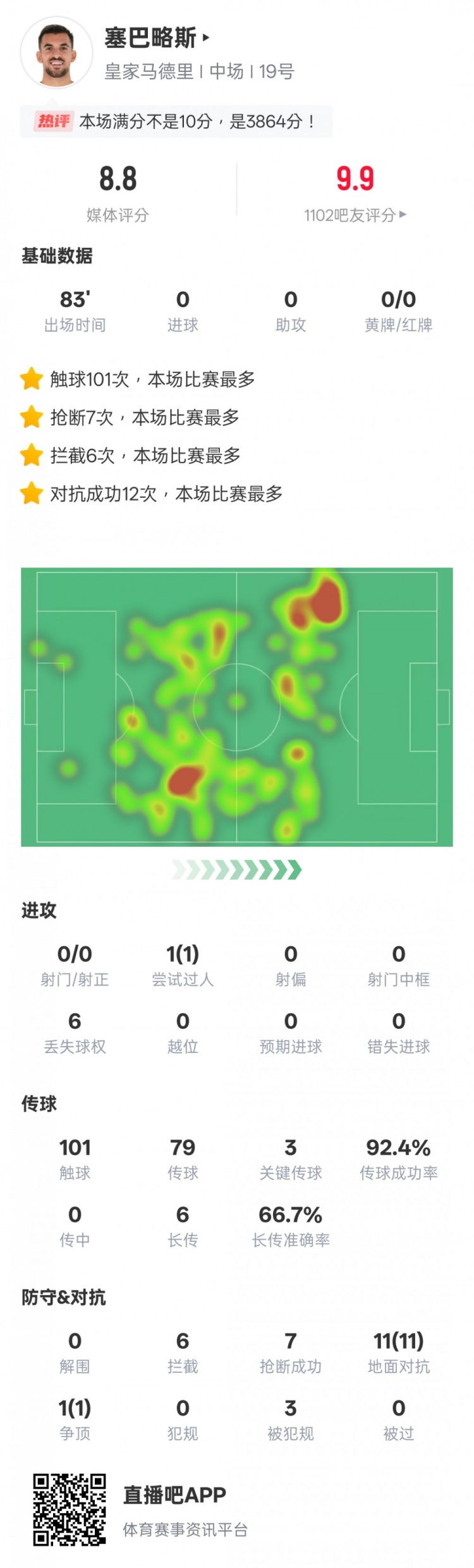 1月20日讯西甲第20轮,皇马4-1拉斯帕尔马斯。本场比赛,塞巴略斯首发出战,送出3次关键传球,还有7次抢断和6次拦截均是全场最多,12次对抗均成功,评分8.8。