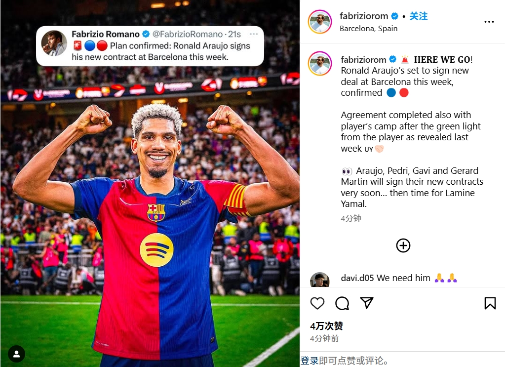 罗马诺称,巴萨将在本周与阿劳霍续约,here we go!接下来将是佩德里、加维、杰拉德-马丁的续约工作也将完成,然后就是亚马尔。