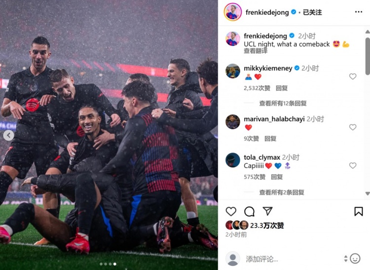 本场比赛德容替补登场,他也在个人社媒晒出众队友庆祝拉菲尼亚绝杀的合照,配文写道:“欧冠之夜,多么精彩的逆转