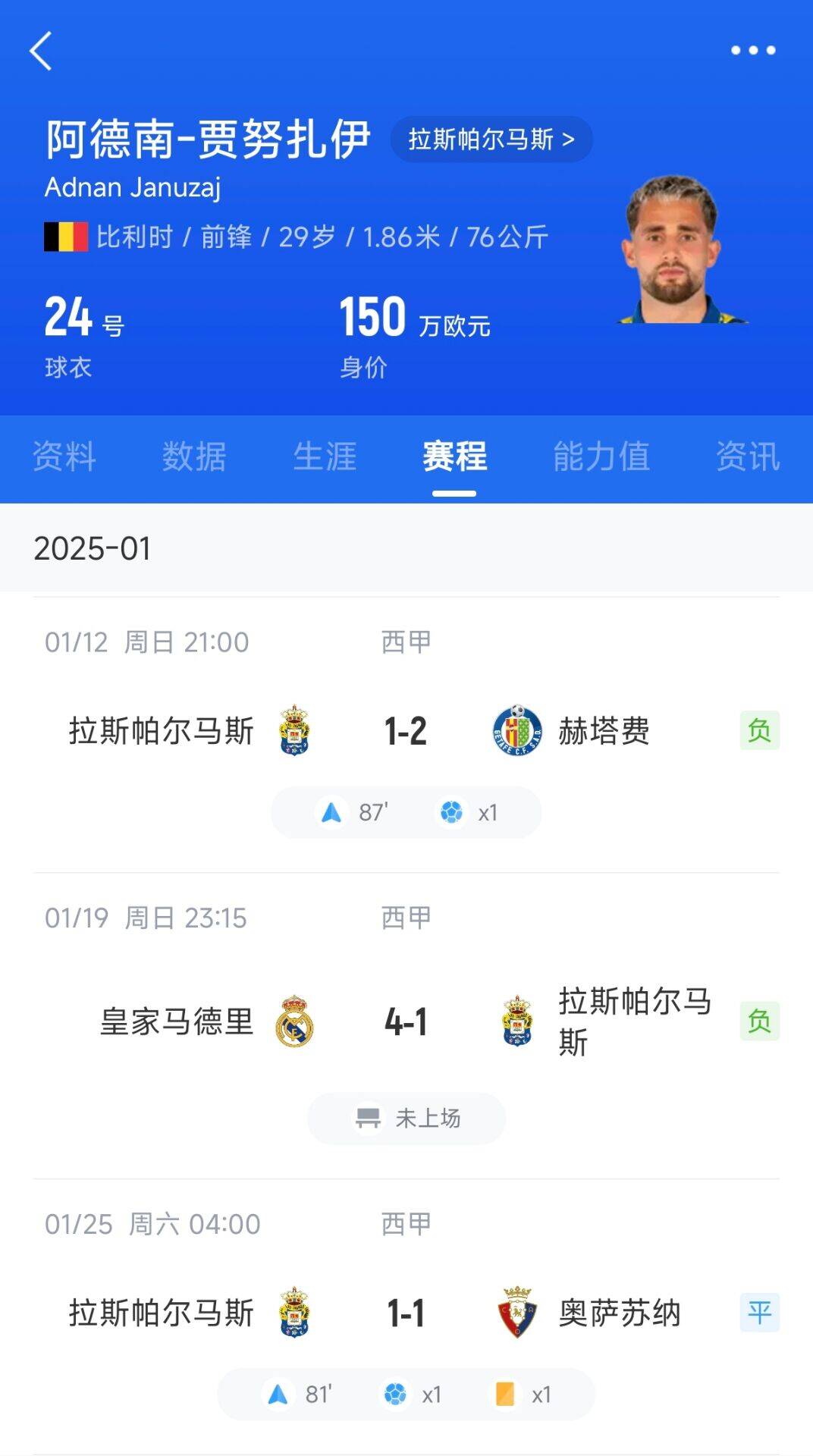01月25日讯 西甲第21轮,拉斯帕尔马斯1-1绝平奥萨苏纳。曼联昔日的妖星贾努扎伊打入任意球,在补时绝平,帮助拉帕拿下保级路上珍贵的1分。