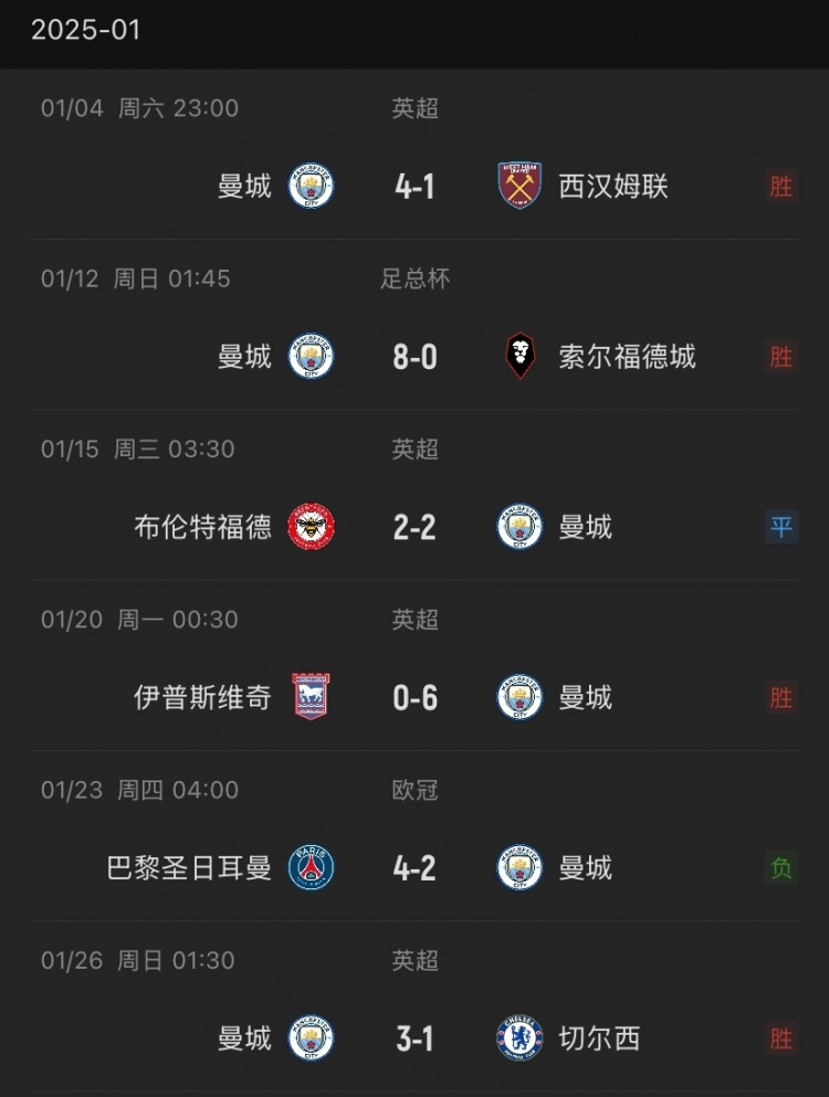 1月26日讯 本轮英超焦点战,曼城主场3-1逆转击败切尔西。在2025年,曼城结束了低迷状态,近6场各项赛事中只在欧冠中输给了巴黎。