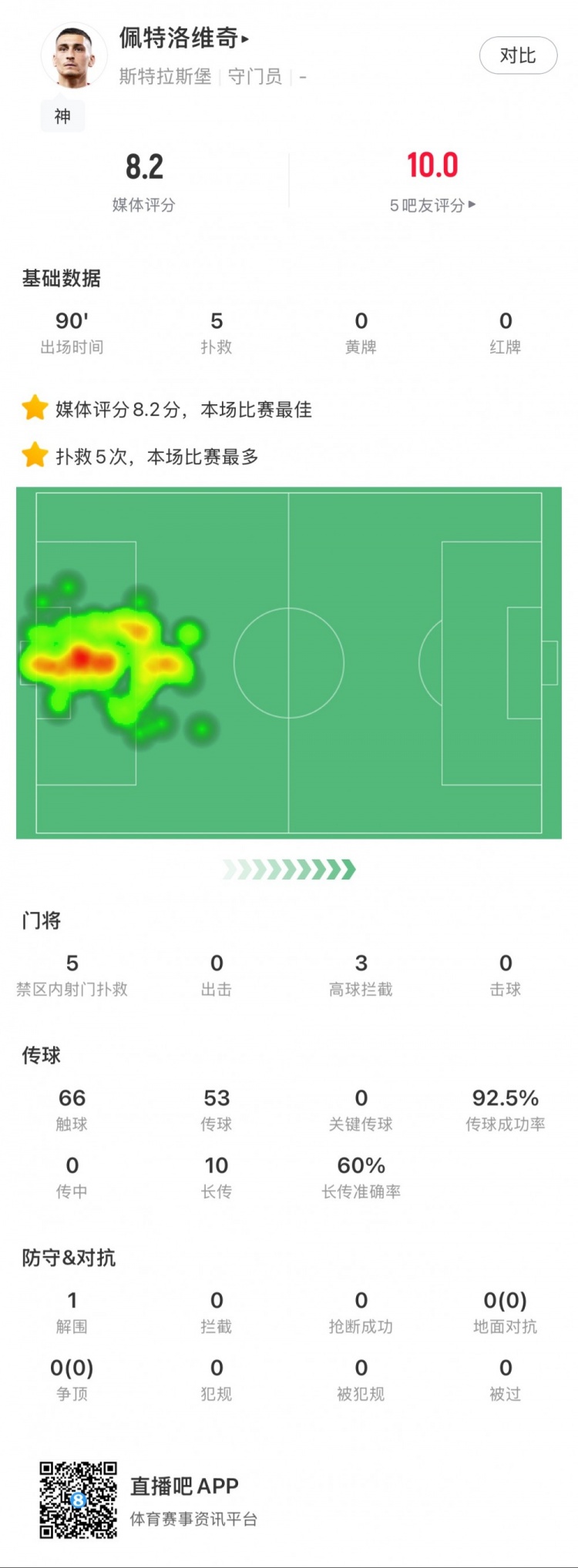 本场比赛中,切尔西外租白堡门将佩特洛维奇送出了5次成功扑救,3次高球拦截,1次解围,帮助球队以2-1的比分获胜。