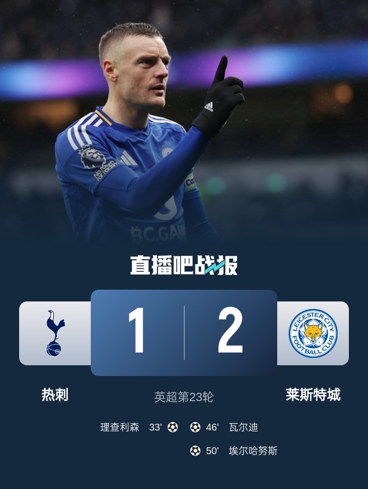热刺1-2不敌莱斯特城,瓦尔迪本场破门!此役过后,热刺近10轮8负,莱斯特城则终结联赛7连败。