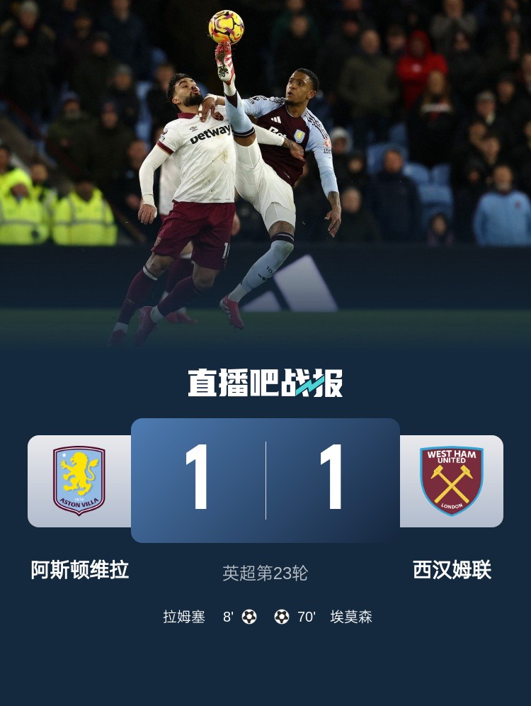 维拉本轮1-1西汉姆,拉姆塞、埃默森为两队进球。