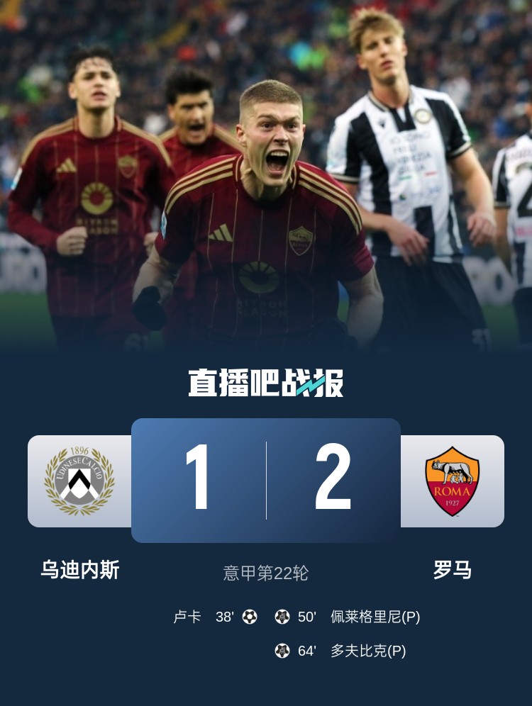罗马2-1逆转击败 乌迪内斯,佩莱格里尼和多夫比克破门。
