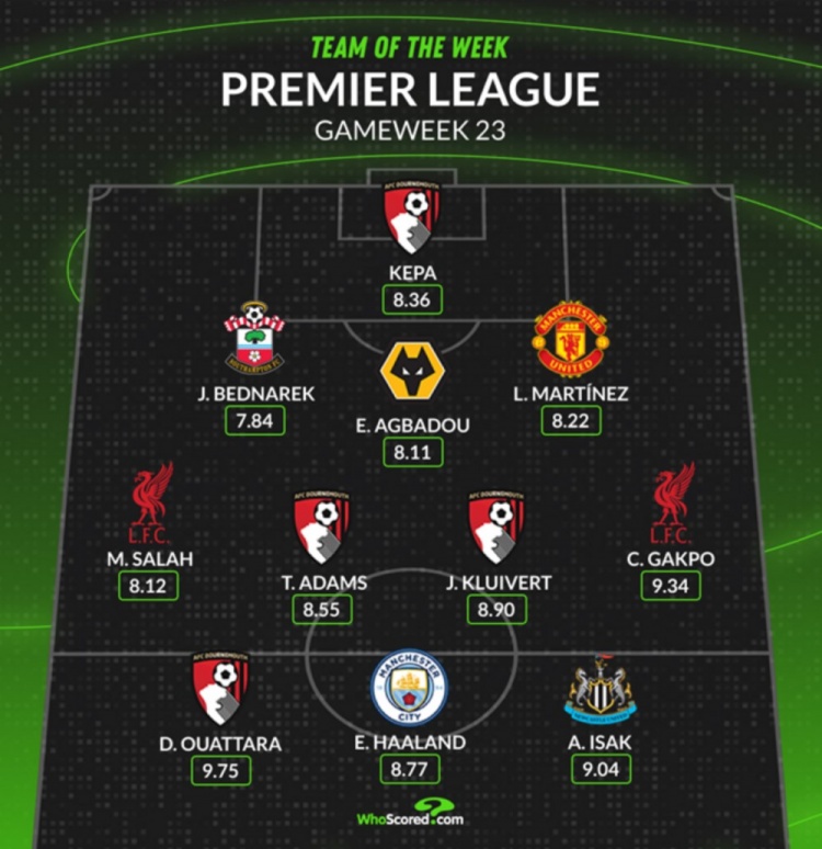 中场:萨拉赫(利物浦)、亚当斯(伯恩茅斯)、克鲁伊维特(伯恩茅斯)、加克波(利物浦)