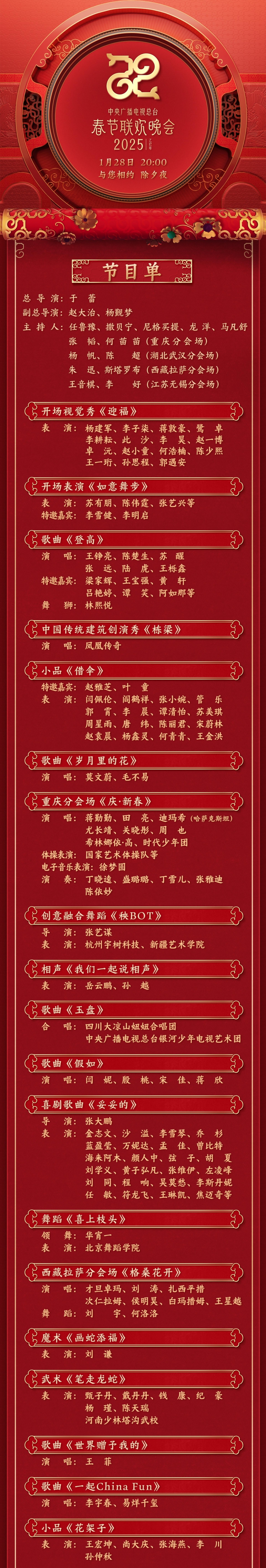 中央广播电视总台《2025年春节联欢晚会》节目单正式发布。王菲时隔7年再上春晚!奥运健儿曹缘、刘宇坤、邹敬园、张雨霏、辜海燕、冯雨、李雯雯、王昶、伍鹏、邓雅文将与陈奕迅共同演唱《孤勇者》。