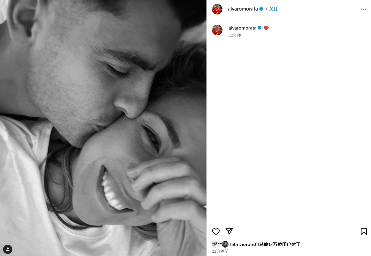 莫拉塔在去年8月正式宣布与妻子艾丽斯离婚的消息,两人2017年结婚育有4个孩子。昨日八卦专家Alessandro Rosica透露,米兰前锋莫拉塔已经与前妻复合,并且女方本人也为这一消息点赞。