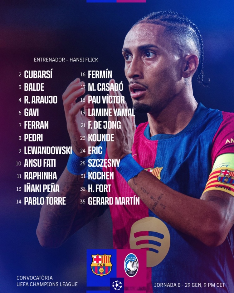 1月29日讯 北京时间明天凌晨4点,巴萨将在欧冠第8轮比赛中主场对阵亚特兰大,巴萨公布了此役的球员名单,莱万、亚马尔、拉菲尼亚、法蒂在列,佩德里回归,克里斯滕森、奥尔莫因伤缺席。