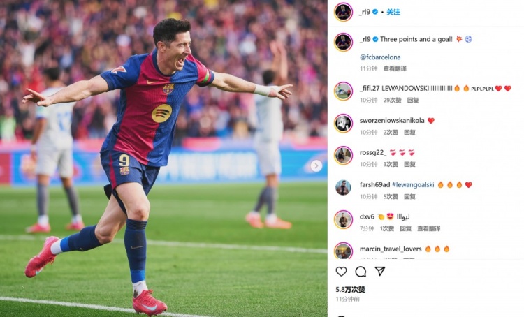 莱万也在赛后通过社媒晒出自己的庆祝照,并配文:“3分和1粒进球。”