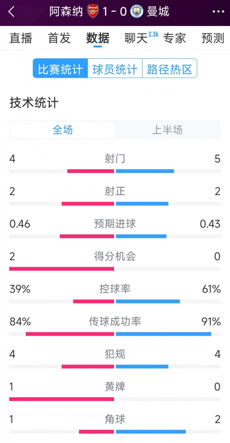 2月3日讯 在本轮英超焦点战,曼城对阵阿森纳半场结束,阿森纳凭借厄德高进球1-0领先。以下为双方半场数据对比: