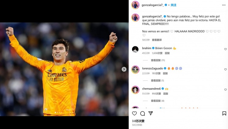他也在赛后通过社媒晒出自己的庆祝照,并配文:“我高兴到不知道该说什么了……我很高兴能够打进这粒永远不会忘记的进球,但更高兴的是取得胜利。永远要战斗到最后一刻!半决赛见!马德里前进!”