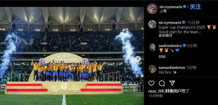 李可社媒庆祝申花夺冠:超级杯夺冠,这是球队的完美开局