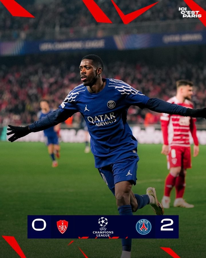 2月12日讯 巴黎在本轮欧冠附加赛2-0领先布雷斯特,登贝莱连场破门。