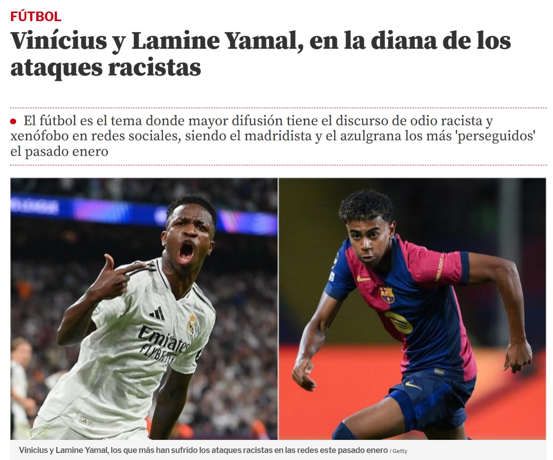 02月15日讯 西班牙媒体《世界体育报》消息,现在足球领域成西班牙网络仇恨言论重灾区,而皇马的维尼修斯和巴萨的亚马尔都是被种族攻击的两位靶心球员。