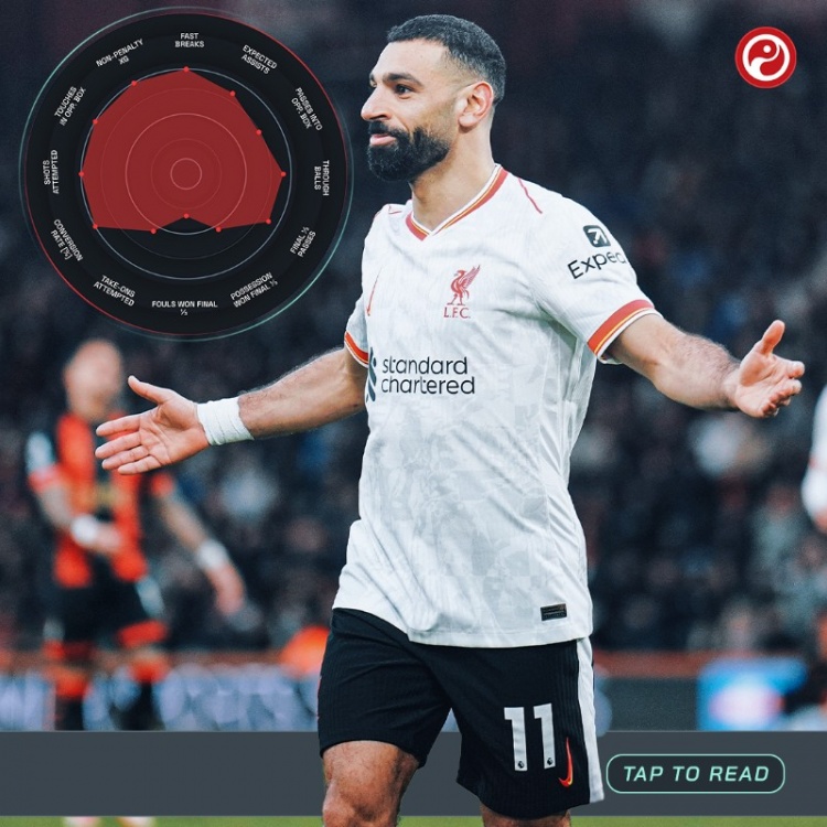 数据统计显示,这位32岁的埃及边锋本赛季英超24场全勤,贡献22球14助攻,每59分钟直接参与1球。