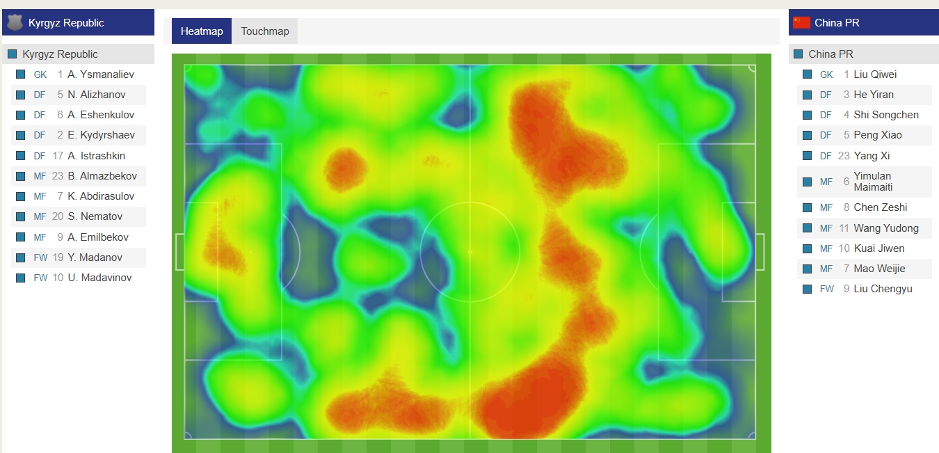 国青(深蓝)半场12次攻入对手禁区,吉尔吉斯斯坦在国青禁区内仅3次触球