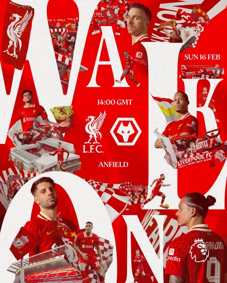 利物浦官方社媒发布了为此役制作的海报,范迪克、努涅斯、迪亚斯、赫拉芬贝赫、若塔、索博斯洛伊等球员出镜。
