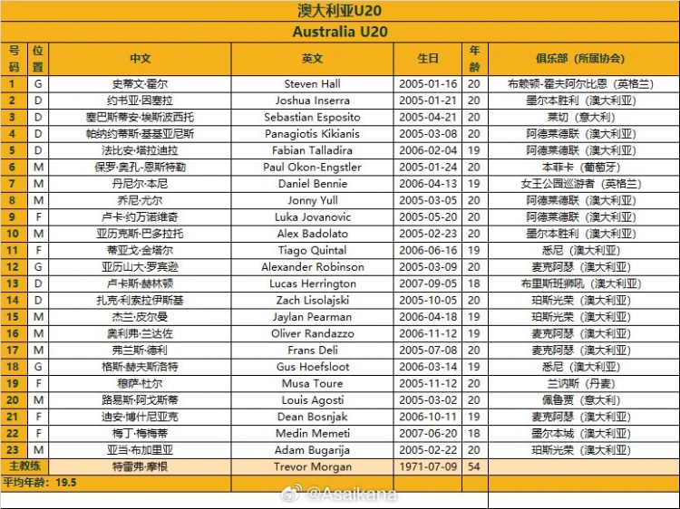 2月17日讯 明晚19:30,U20亚洲杯A组第三轮国青将迎战澳大利亚U20。今日德转中国区管理员朱艺更新社媒,晒出了本场国青的23人大名单。