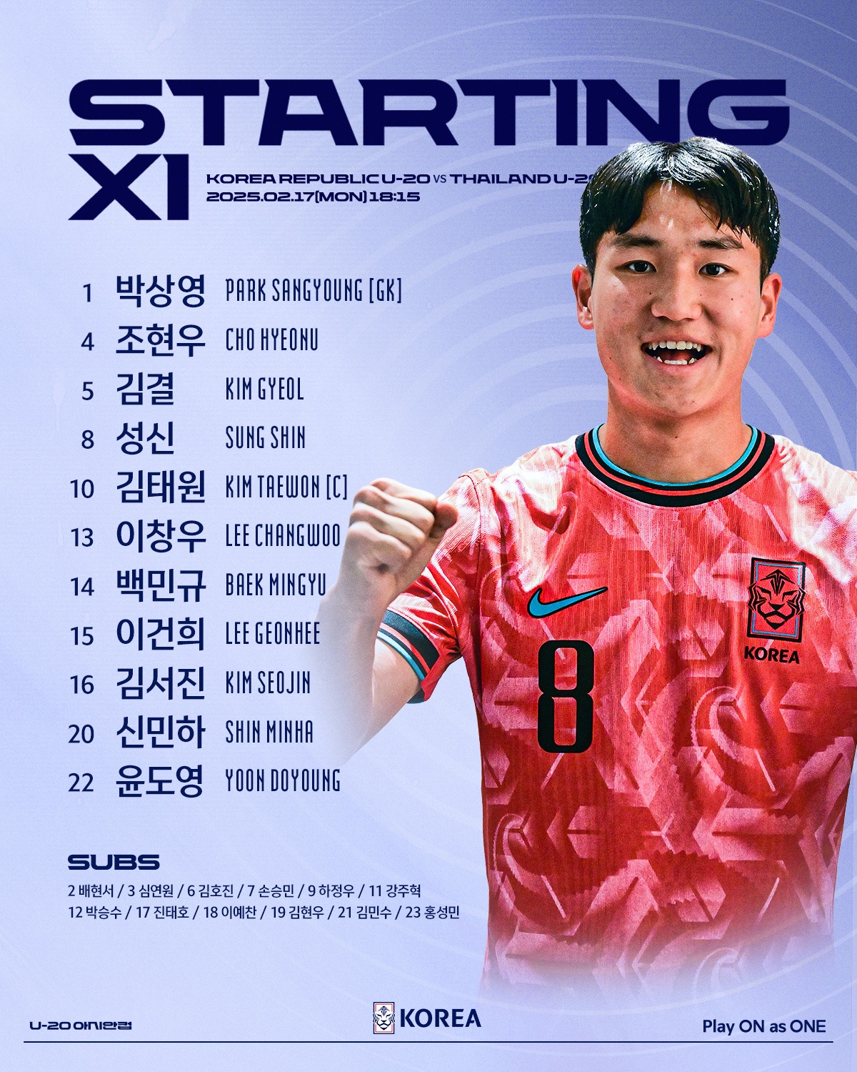 韩国U20首发:1-朴相英、4-赵贤友、16-金书真、20-申民河、8-成信、13-李昌友、15-李建熙、22-尹棹泳、5-金杰、金泰元、14-白民奎