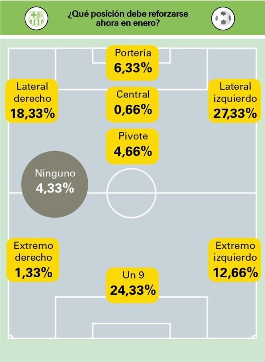 紧随其后的是中锋位置,24.33%的受访者认为巴萨应在1月引进一名9号球员。虽然莱万目前以16球领跑射手榜,但他最近8场联赛仅打入2球。这表明球员可能出现了身体和心理上的疲劳,因此巴萨需要引进一名可靠的中锋来帮助他分担压力。