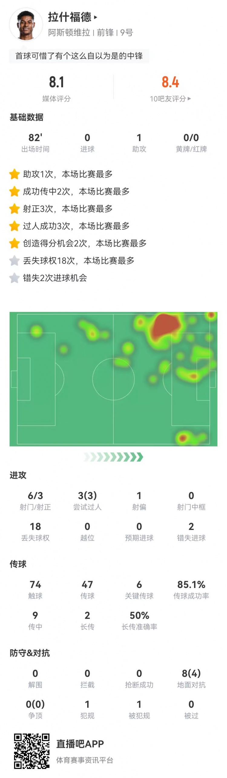 拉什福德本场1助攻+6关键传球2造良机 6射3正2失良机 3过人均成功