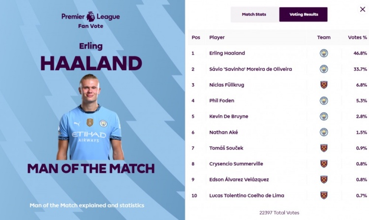 赛后,本场比赛打进2球的哈兰德当选全场最佳球员,他获得了46.8%得票率。