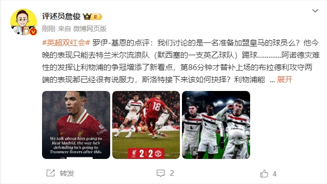 罗伊-基恩的点评:我们讨论的是一名准备加盟皇马的球员么?他今晚的表现只能去特兰米尔流浪队(默西塞的一支英乙球队)踢球.............阿诺德灾难性的发挥让利物浦的争冠增添了新看点,第86分钟才替补上场的布拉德利攻守两端的表现都已经很有说服力,斯洛特接下来该如何抉择?利物浦能拿到一分,还是靠“加克波走廊”的稳定演出,麦卡的后上进攻也有亮点。长远来看,这样的挫折能让全队上下更冷静地分析自身的优缺点,摆正位置。