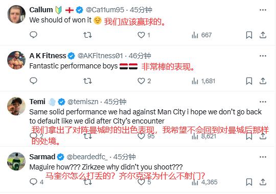 英超第20轮双红会,曼联客场2-2战平利物浦。曼联球迷对球队本场表现感到满意,对未能取胜感到可惜。